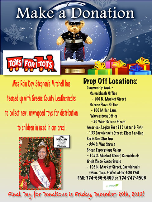The title of Miss Rain Day has given Stephanie the opportunity to participate in numerous parades, attend many events throughout the area, and meet many wonderful people throughout Greene County. This past Christmas, Stephanie teamed up with Community Bank and the Greene County Leathernecks in the Annual Toys for Tots drive. The donations that were brought in through her drop points were over-whelming and helped brighten many children’s lives this Christmas.
